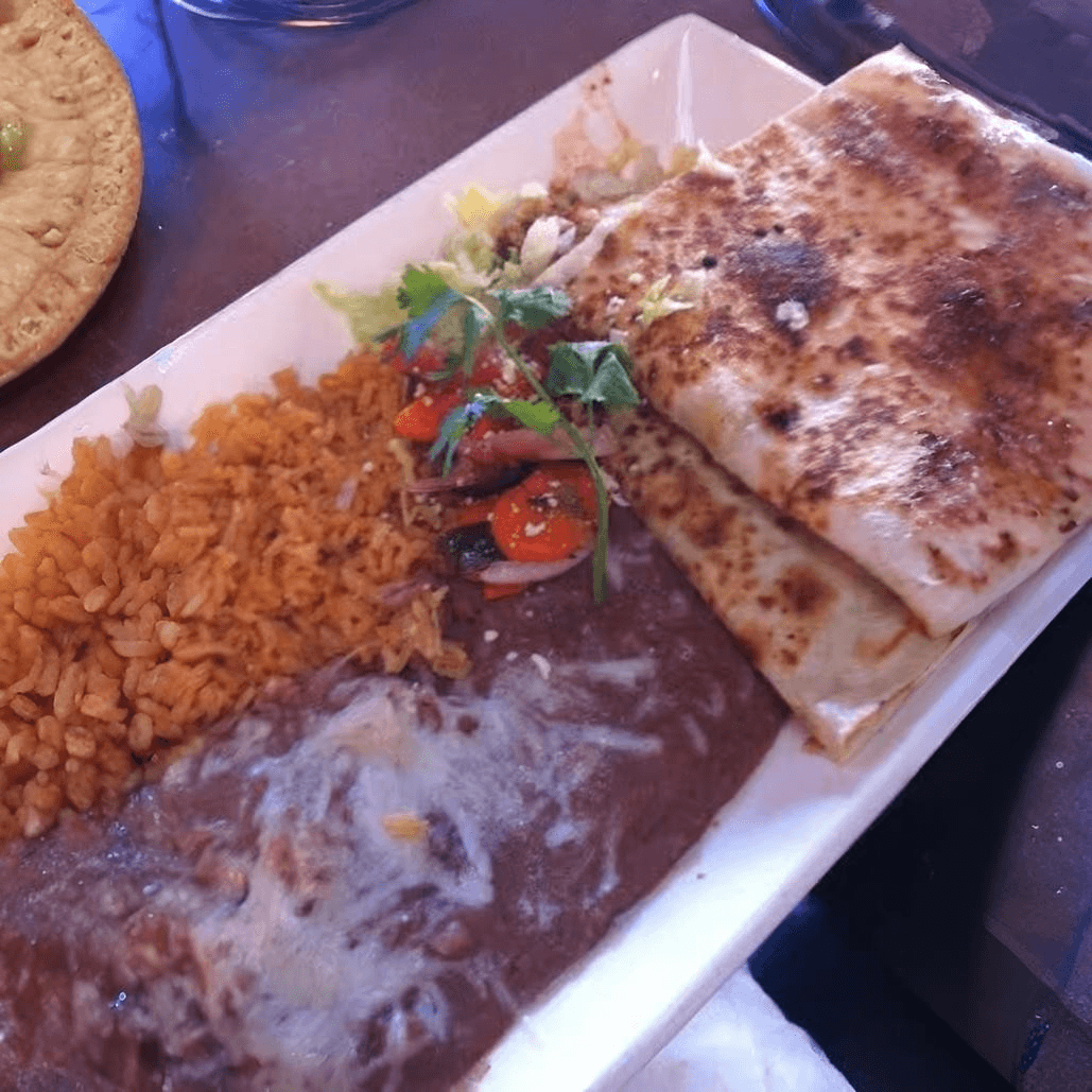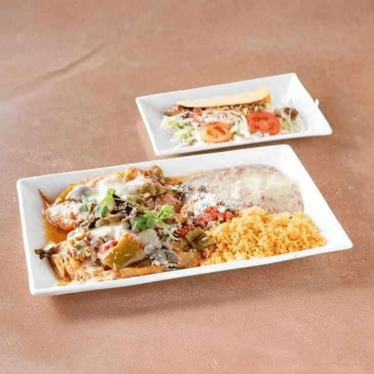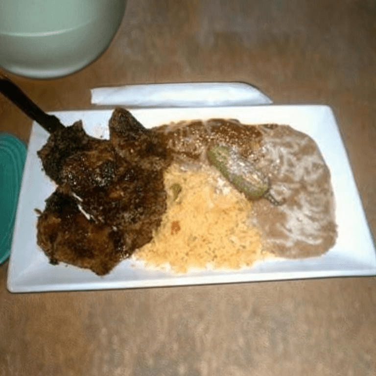 One mole cheese enchilada, grilled thin sliced top sirloin marinated in 100% blue agave tequila, and grilled with chipotle and ground coffee. Served with rice and beans, pico de gallo, and pickled carrots
