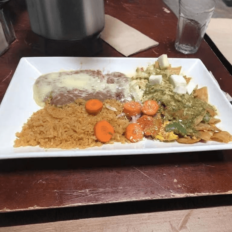 Layered enchiladas topped with red sauce, cheese, your choice of meat, and two eggs. Served with rice and beans, pico de gallo, pickled carrots, and Cotija cheese