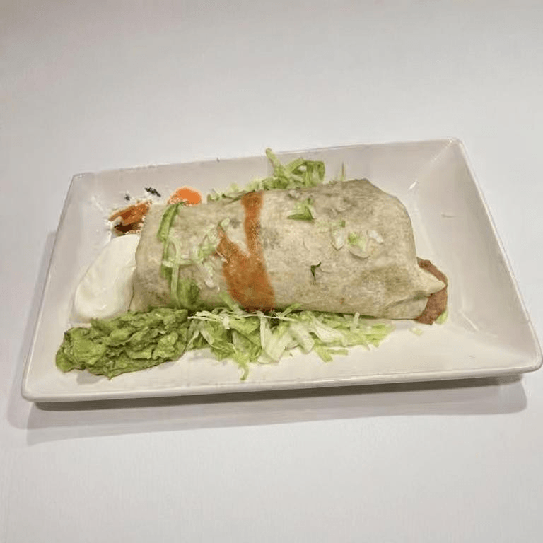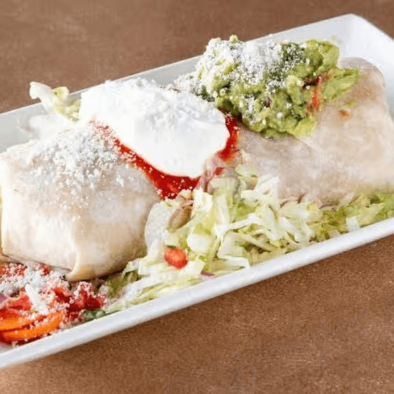 Tequila cream chicken, rice, beans, cheese, corn, chile pasilla, and mushrooms. Topped with sour cream and guacamole