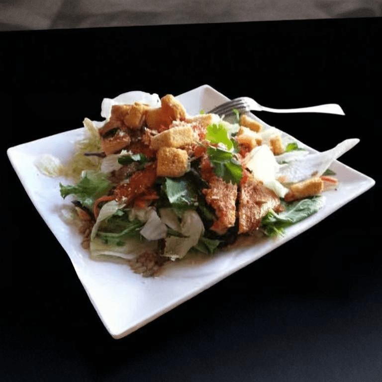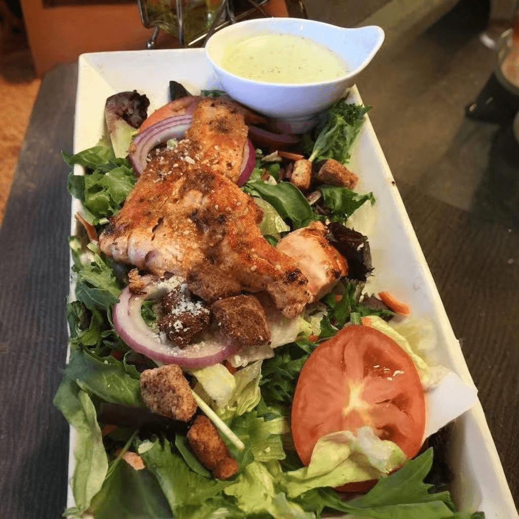Green salad topped with marinated grilled chicken, seasoned croutons, and the dressing of your choice