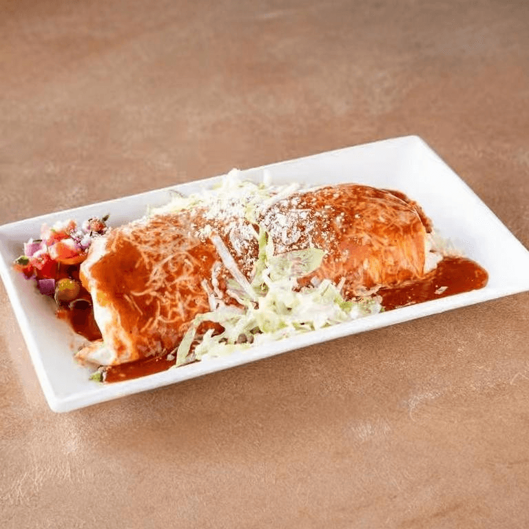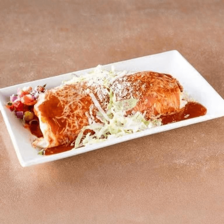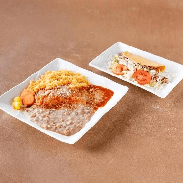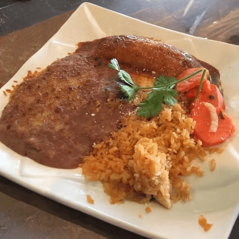 Rolled corn tortilla filled with your choice of meat. Topped with red enchilada sauce and cheese. Served with rice and beans, pico de gallo, pickled carrots, Cotija cheese
