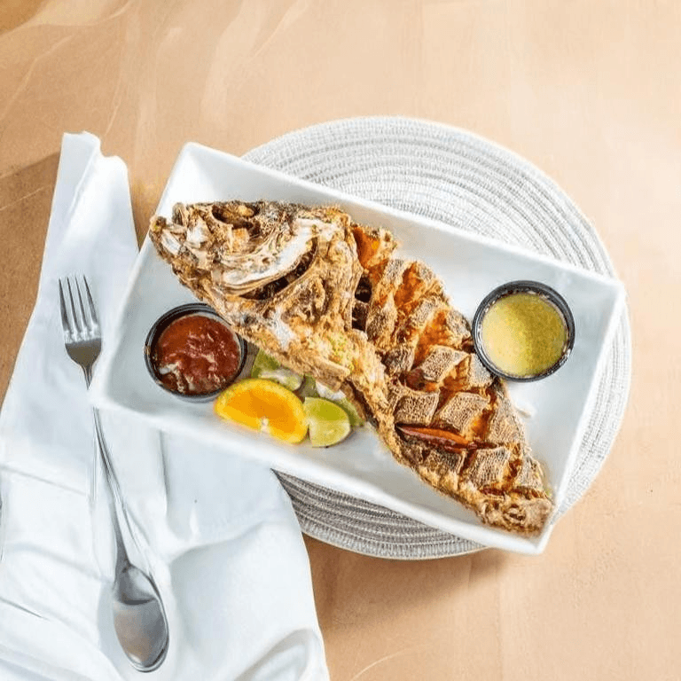 Two whole fish dipped in special batter and lightly crisp. Served with your choice of hot sauce or garlic sauce. Served with rice & beans