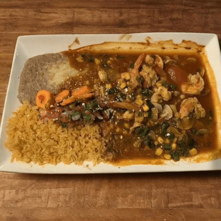 Grilled Shrimp Cooked with corn, chile pailla, onions, and mushrooms, served with rice, beans and cheese inside topped w/sour cream and guacamole