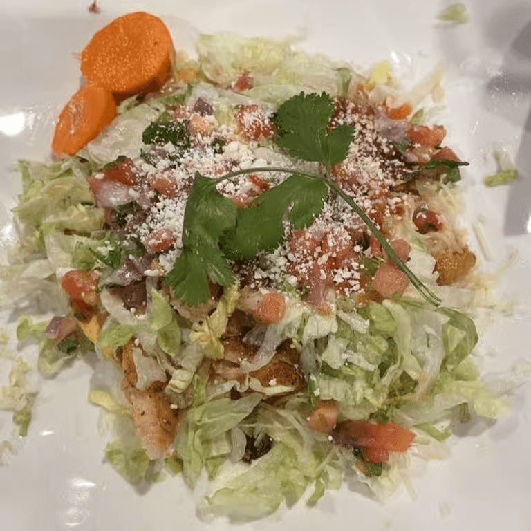 A crispy flat tortilla. Topped with refried beans, lettuce, Cotija cheese, tomato sauce, and your choice of meat. Served with rice and beans, pico de gallo, pickled carrots, and Cotija cheese