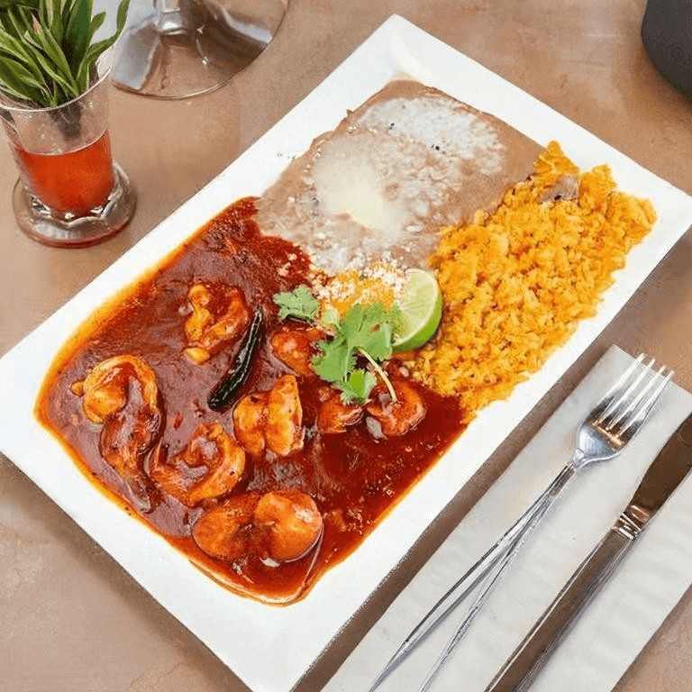 Prawns in mole poblano sauce. Served with rice and beans