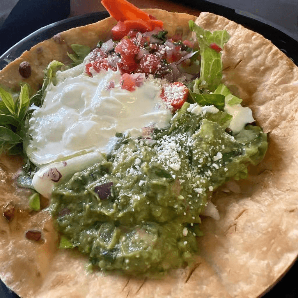 Flour tortilla bowl filled with refried beans and lettuce. Topped with pico de gallo, sour cream, guacamole, and Cotija cheese and your choice of meat