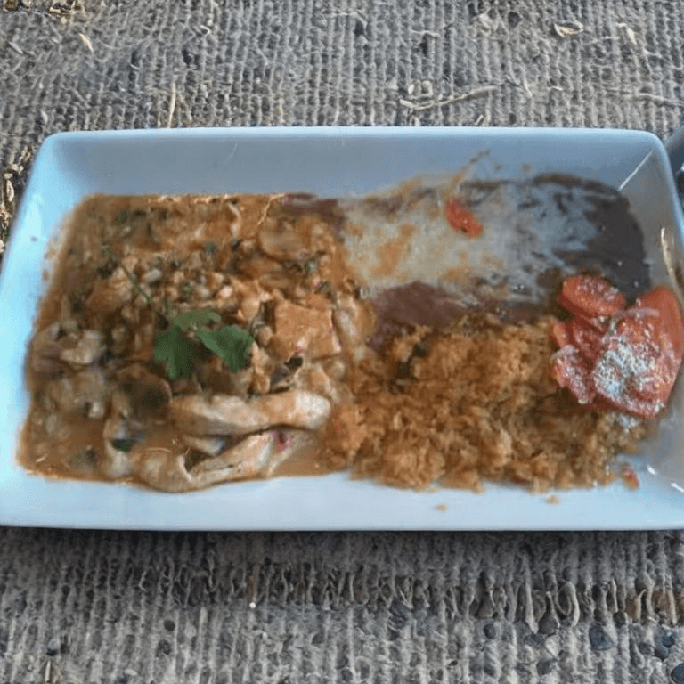 Prawns and octopus simmered in garlic, mushrooms, bell pepper, onions, cheese. Served with rice, beans, pico de gallo, and pickled carrots
