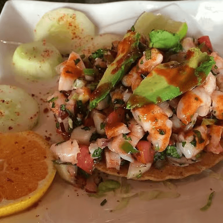 Shrimp torta topped with red sauce, onions and cotija cheese