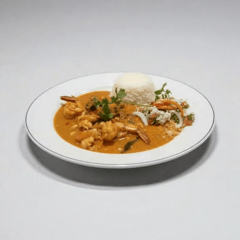 Prawns in a tamarind salsa, corn, and garlic butter. Served with rice, beans, pico de gallo, and pickled carrots