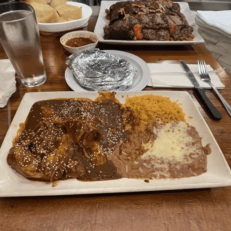Rolled corn tortilla filled with your choice of meat. Topped with mole, cheese, and toasted sesame seeds. Served with rice and beans, pico de gallo, pickled carrots, and Cotija cheese
