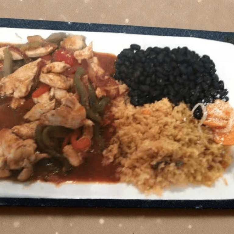 Chicken sauteed with onions, tomatoes, bell peppers and jalapeno sauce. Served with rice, beans and tortillas