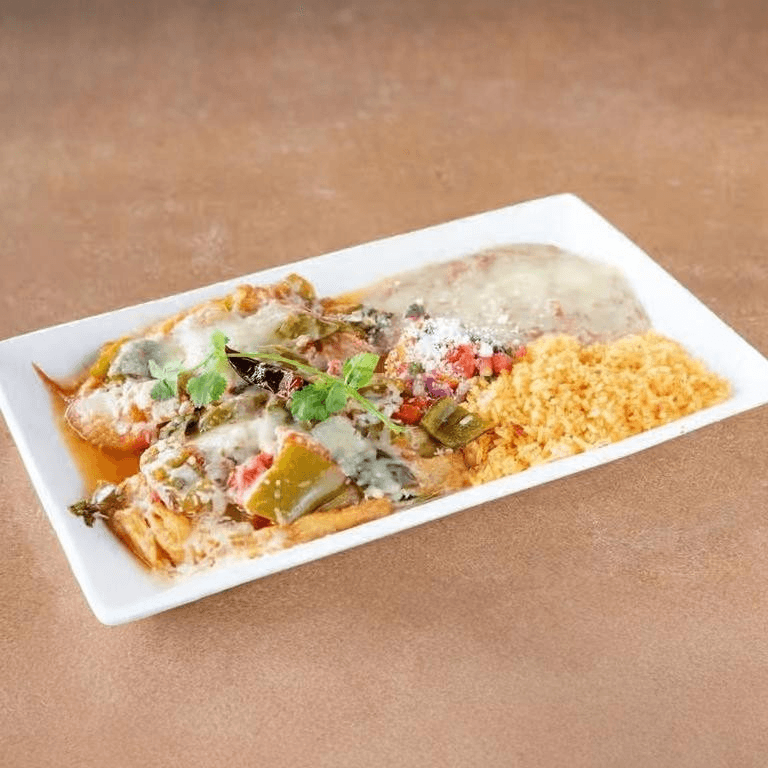 Topped with red enchilada sauce and topped with cheese. Served with rice and beans, pico de gallo, pickled carrots, and Cotija cheese