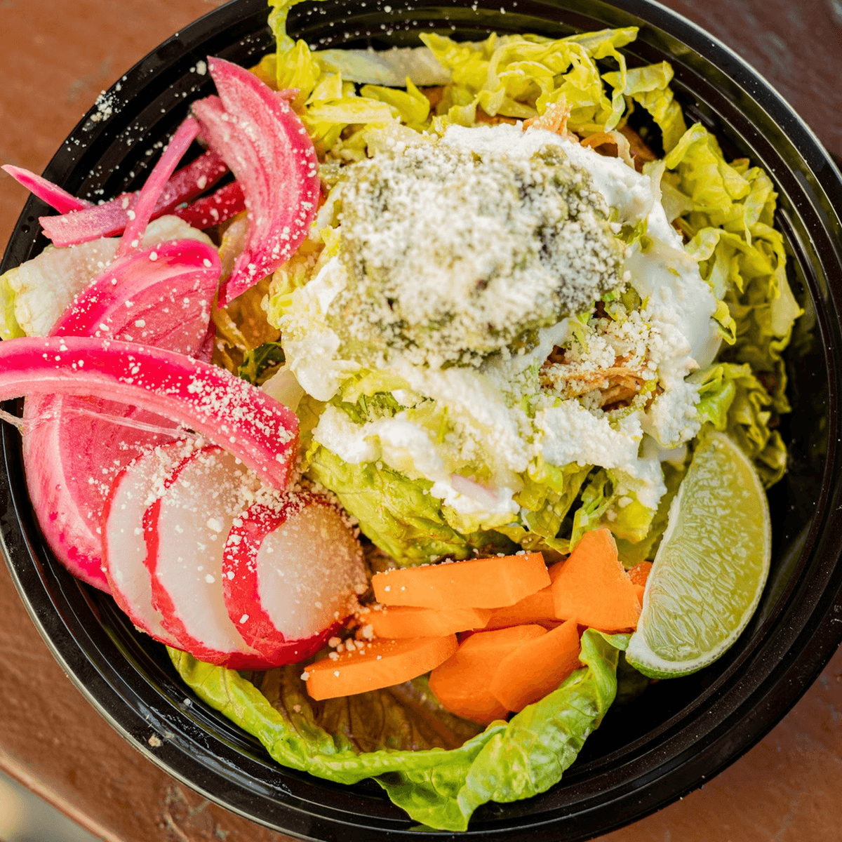A crispy flat tortilla. Topped with refried beans, lettuce, Cotija cheese, tomato sauce, and your choice of meat. Served with rice and beans, pico de gallo, pickled carrots, and Cotija cheese