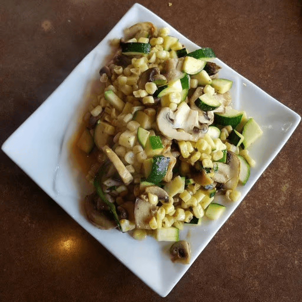 Mushrooms, zucchinis, onions, tomatoes, bell peppers, and carrots with cheese. Served with rice, beans, tortillas, nopal, and queso fresco