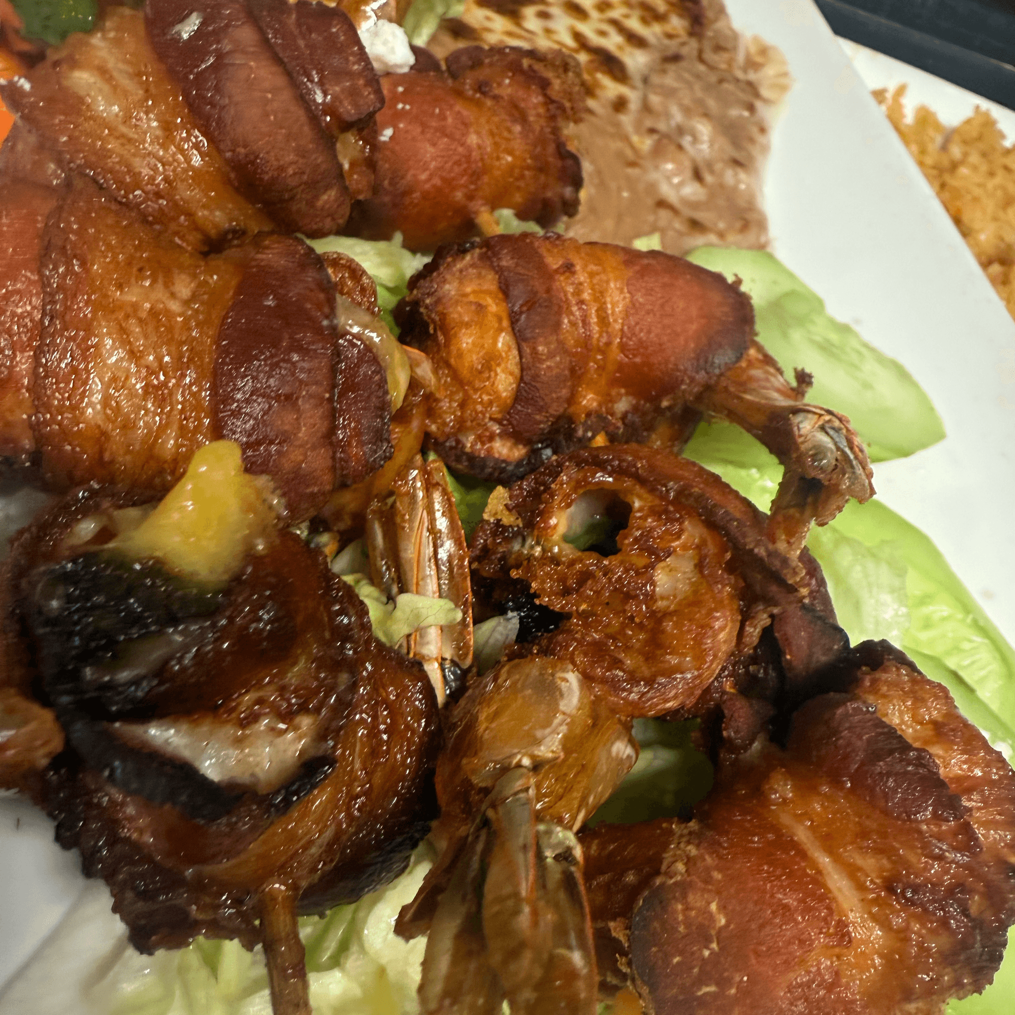 Bacon wrapped prawns stuffed with cheese and sliced jalapeno peppers. Served with rice, beans, pico de gallo, and pickled carrots