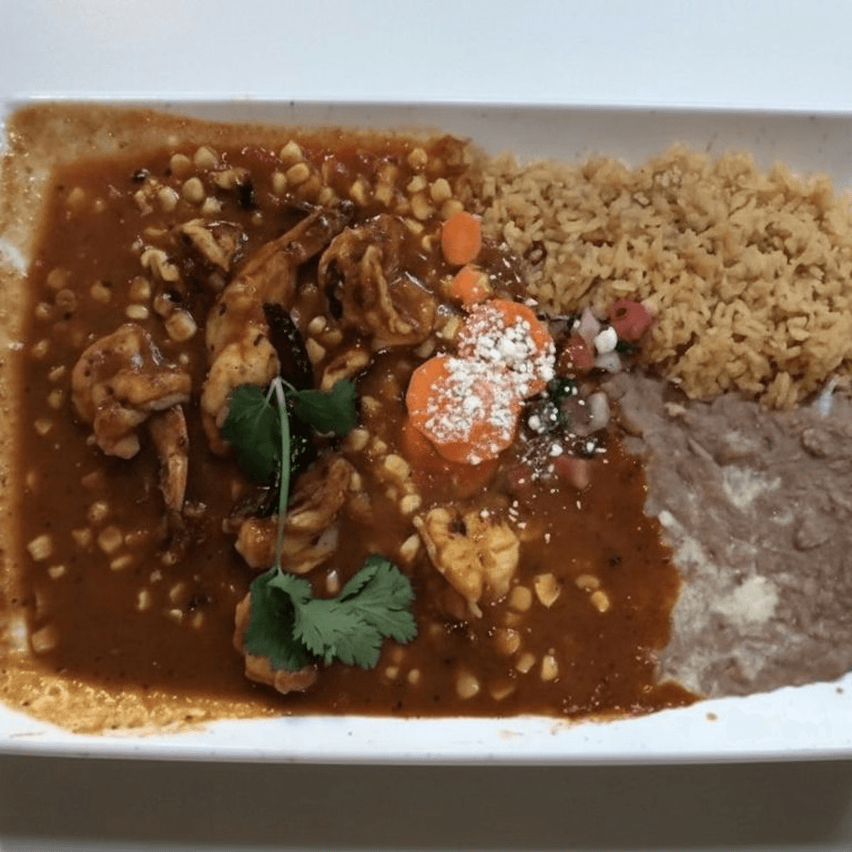 Prawns in a tamarind salsa, corn, and garlic butter. Served with rice, beans, pico de gallo, and pickled carrots